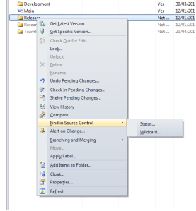Normally, I would use the “tf undo” command at the Visual Studio Command Prompt to sort this out, but yesterday I ran into an odd situation where I could not see the pending changes via the tf command, even though I could see them in Visual Studio. Anyhow, I accidentally found a menu item that lets me find pending changes on any part of the source tree, and gives me the opportunity to undo other users’ checkouts on the server.