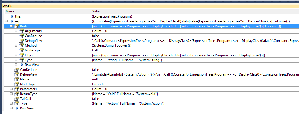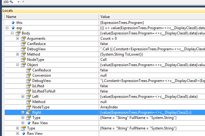 We can see that the Object is an ArrayIndex. You’ve got a Left which is the array ((ExpressionTrees.Program+<>c__DisplayClass0).data), and you’ve got a Right which is the index ((ExpressionTrees.Program+<>c__DisplayClass2).i).